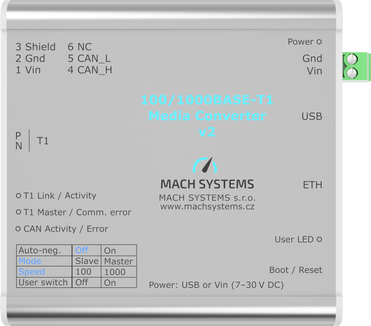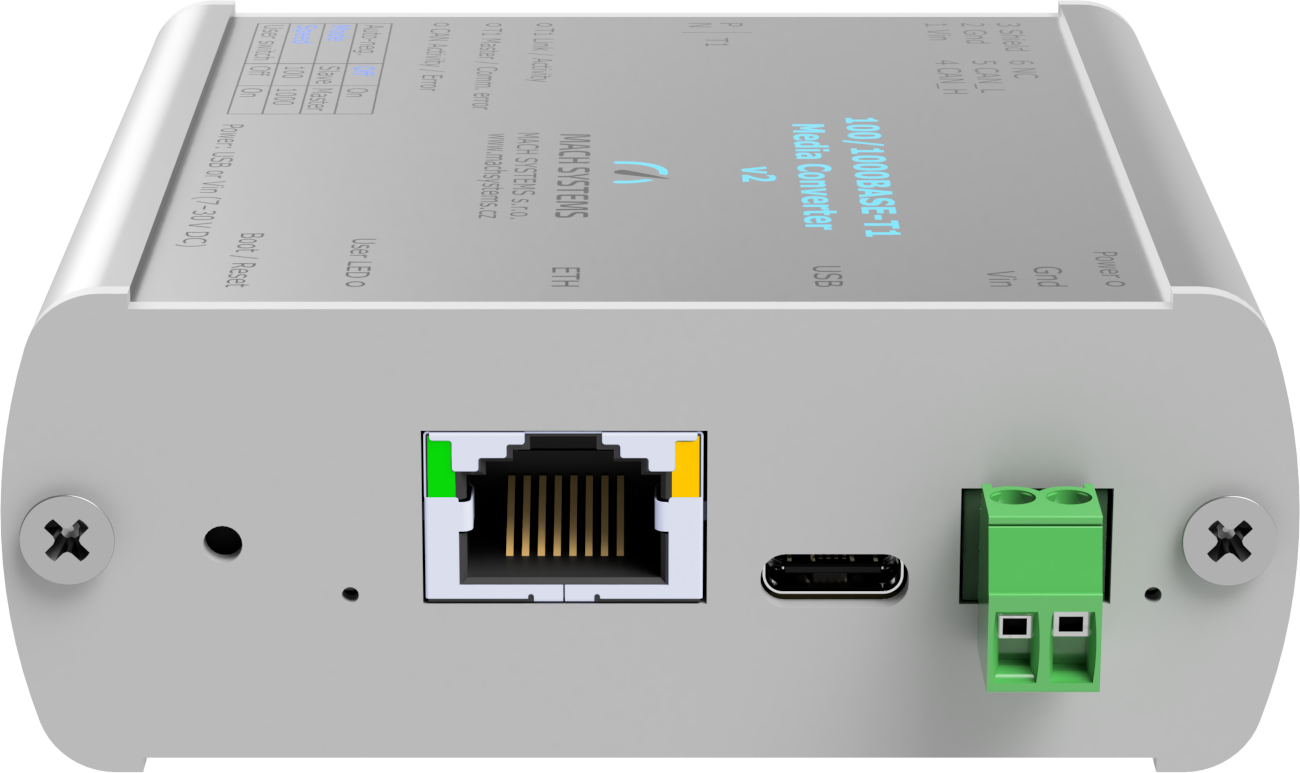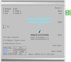 MACH SYSTEMS proudly presents the 100/1000BASE-T1 Media Converter v2, a next-generation solution designed to bridge automotive Ethernet (100BASE-T1 / 1000BASE-T1) with standard Fast and Gigabit Ethernet networks — now enhanced with MACsec (TC17) security and TC10 sleep/wake-up functionality.