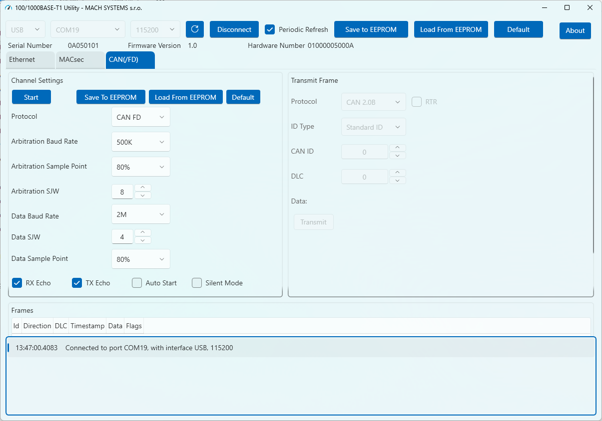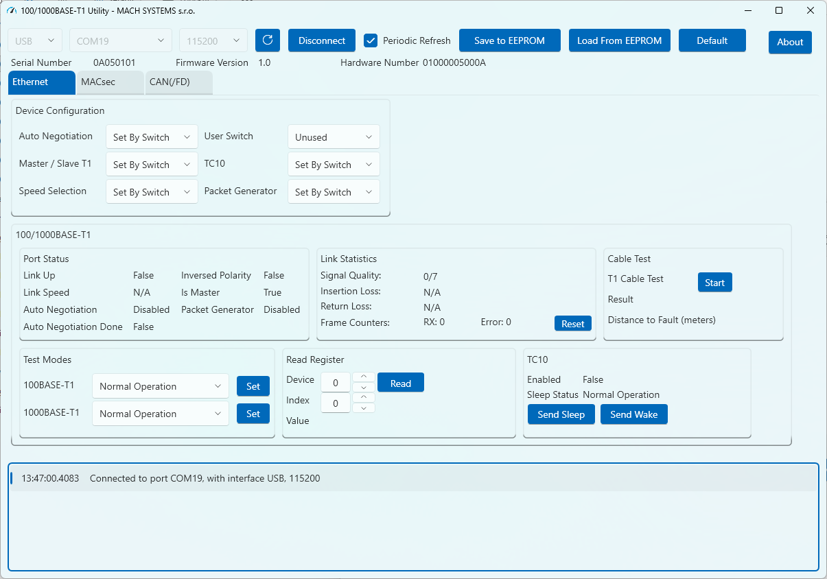 The open communication protocol is available to access the media converter over USB or CAN(/FD). The protocol allows to remotely read status and configure both T1 and standard Ethernet ports, configure TC10 and MACsec, and use the device as a USB-CAN(FD) interface.
