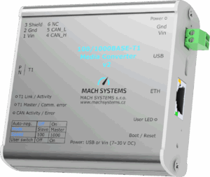The media converter offers advanced features such as frame generator, cable diagnostic, as well as a possibility to be used as a USB to CAN(/FD) interface simultaneously with the media conversion function. The device uses the H-MTD Automotive Ethernet connector (USCAR 777-U-002-1-Z01 compliant).