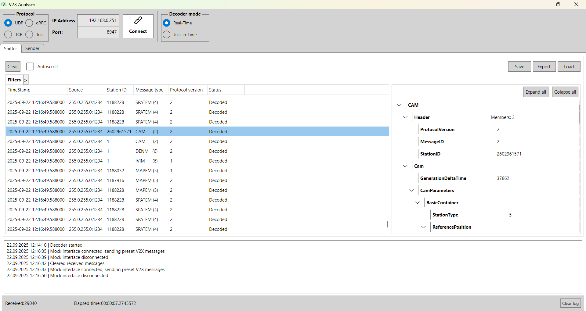 The application supports CAM, DENM, SPATEM, MAPEM, IVIM, SREM, SSEM, RTCMEM, and CPM message types.